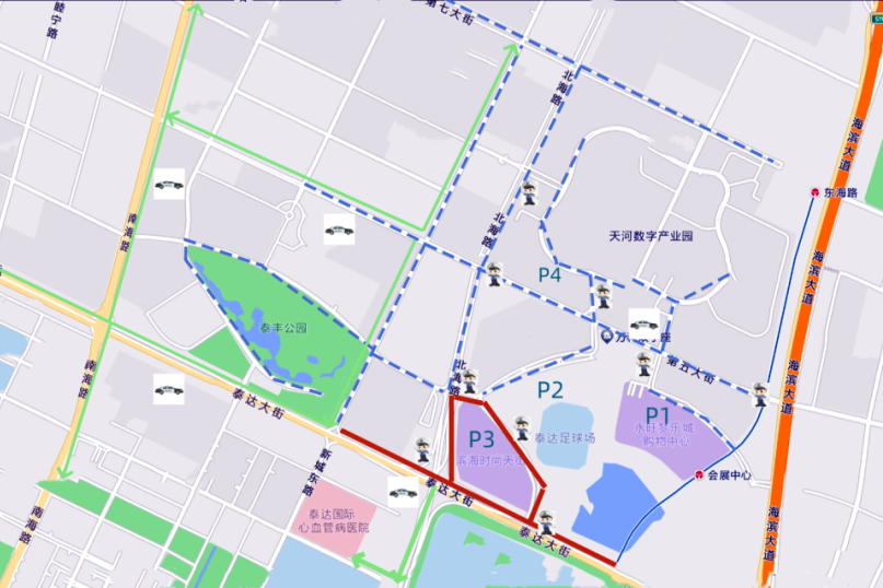 京津塘高速—泰达大街—南海路—周边停车场。
