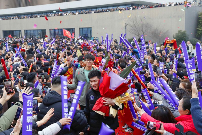 1月17日下午,晋级四强的富阳队载誉凯旋,近万名市民聚集在道路两侧,手拉横幅,挥动紫色队旗与加油棒。“这里是哪里?”“富阳!富阳!”“富阳富阳,区县最强……”铿锵有力的声浪此起彼伏,彩带飞舞,拼搏的汗水与城市的自豪在此刻交融。