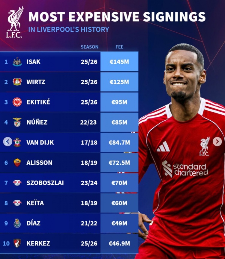 9月2日讯 利物浦压哨签下今夏标王伊萨克,《转会市场》也统计了红军队史最贵买人情况,前三均为今夏新援。